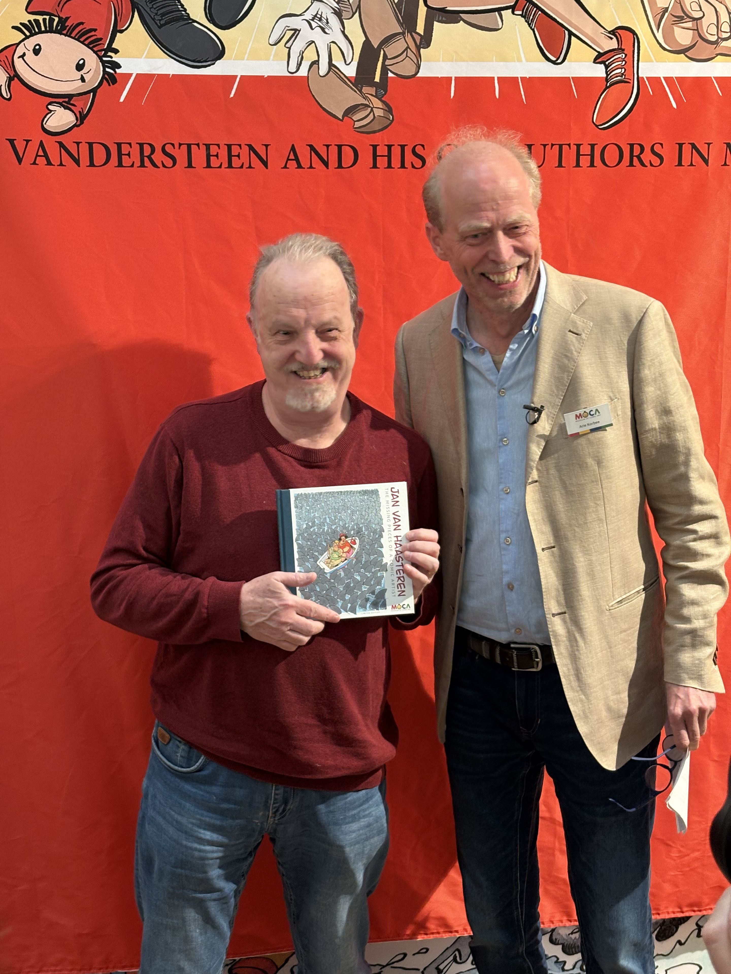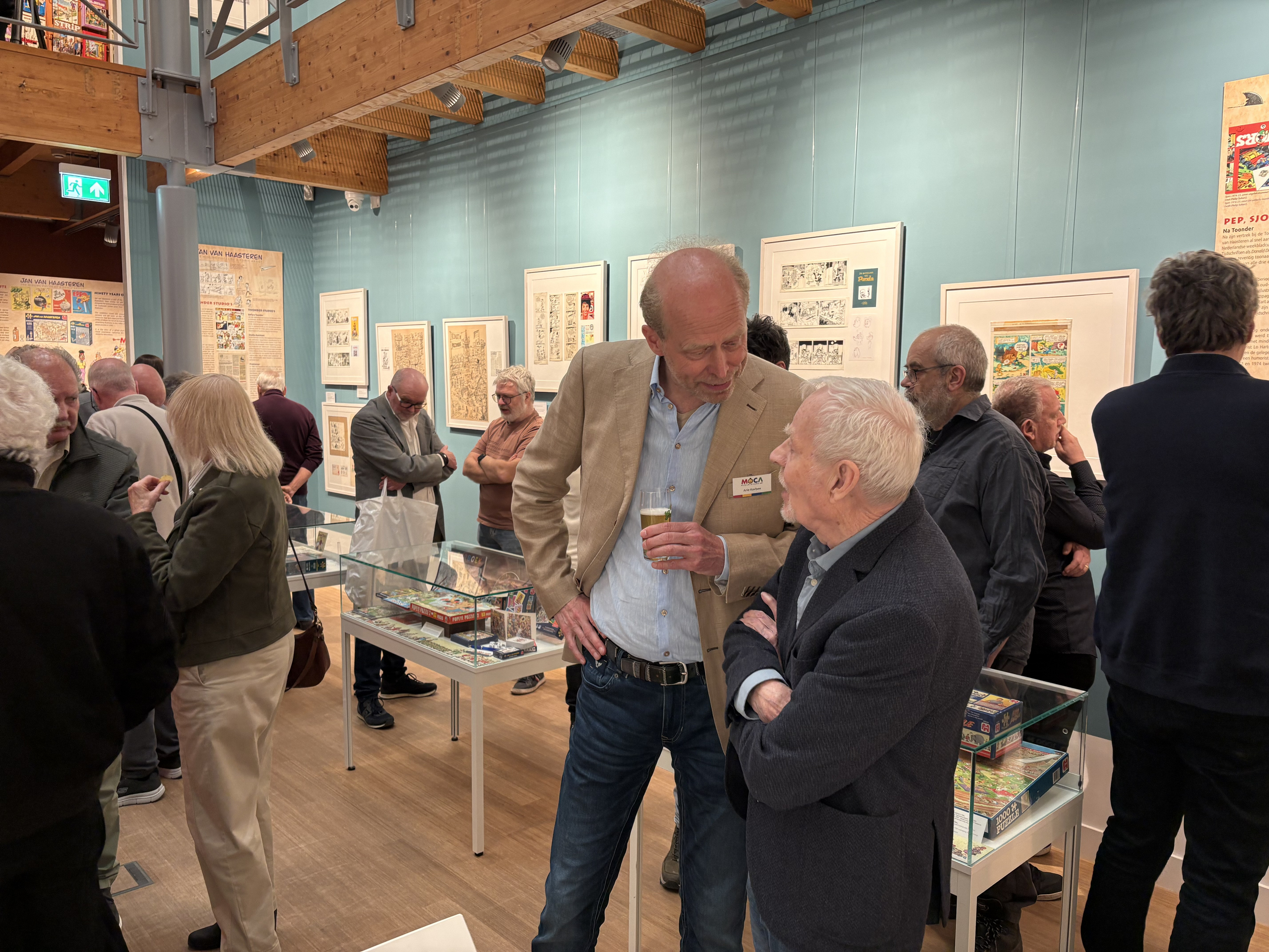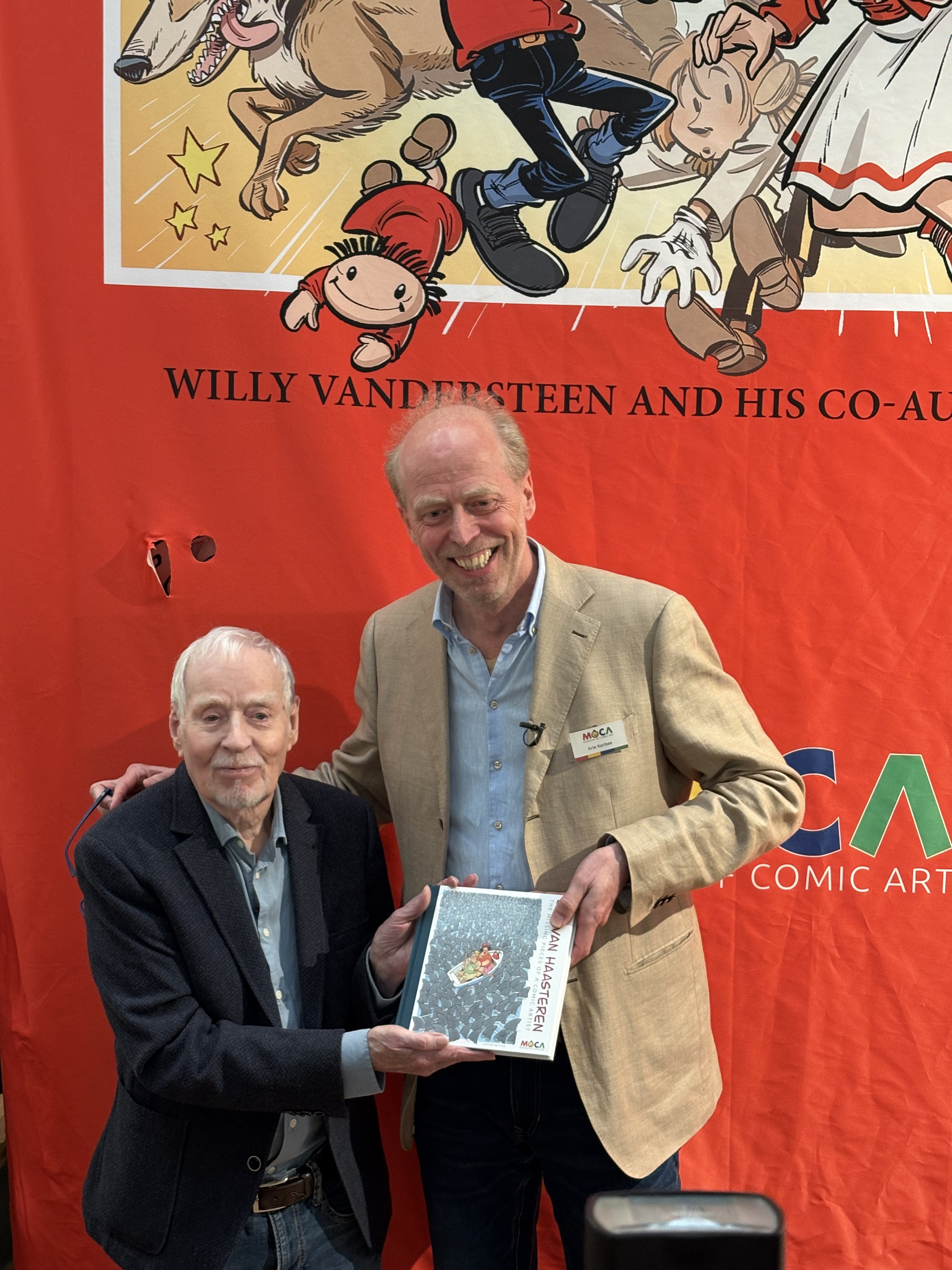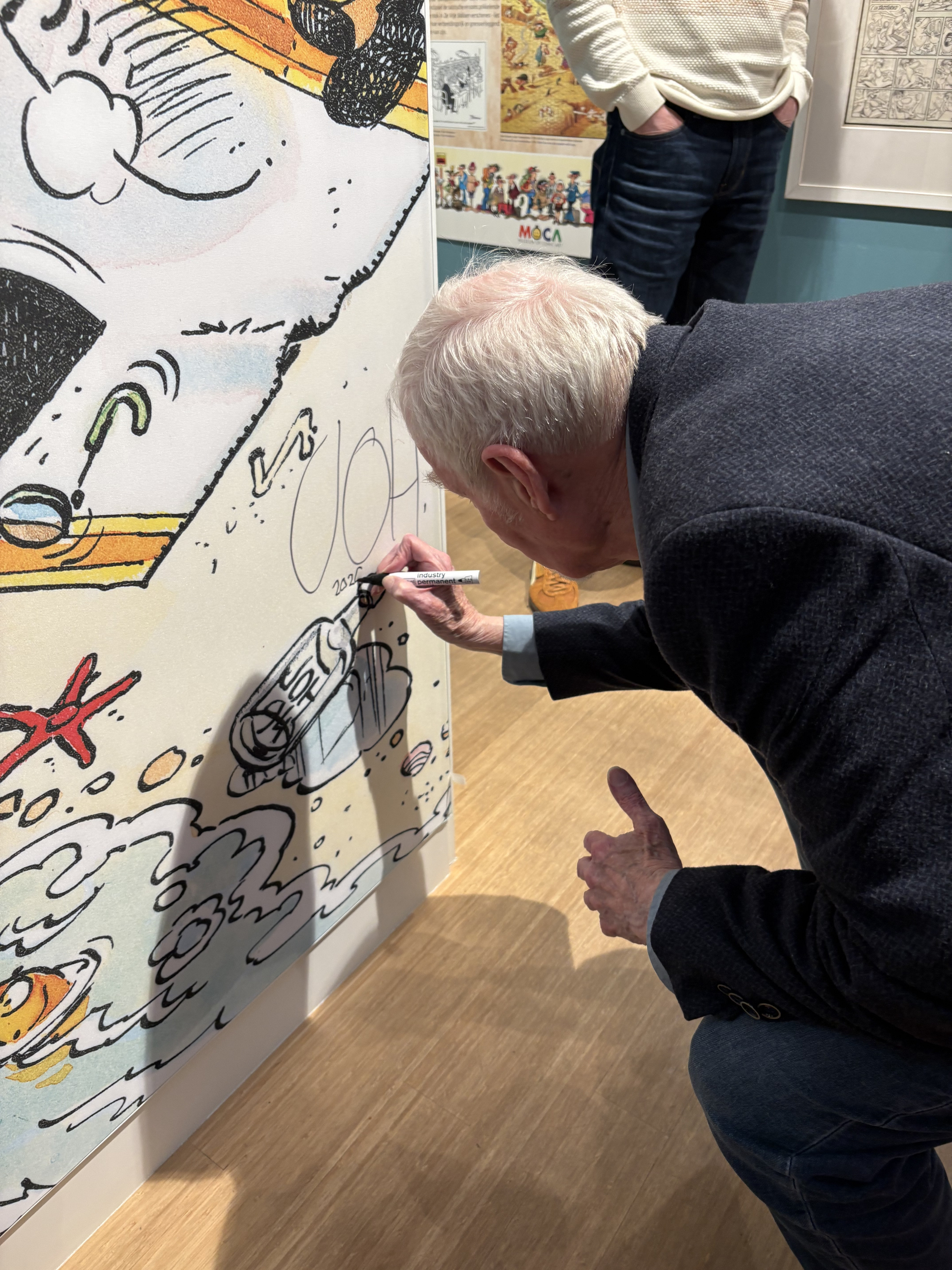 Zowel Jan van Haasteren, zijn dochter Saskia en curator van deze tentoonstelling, Ger Apeldoorn, ontvingen uit handen van MoCA voorzitter, Arie Korbee, het eerste exemplaar van de Limited Edition catalogus.