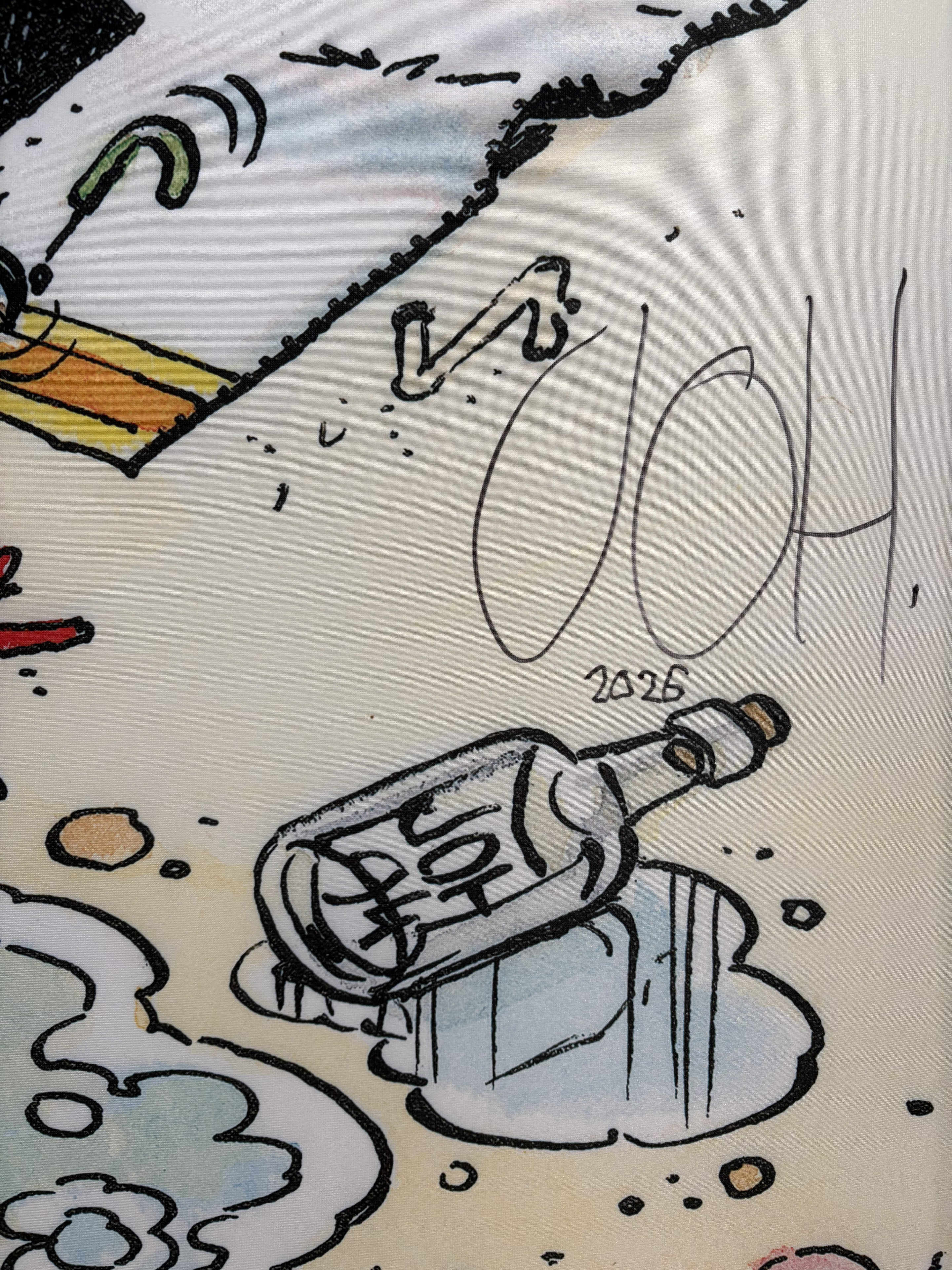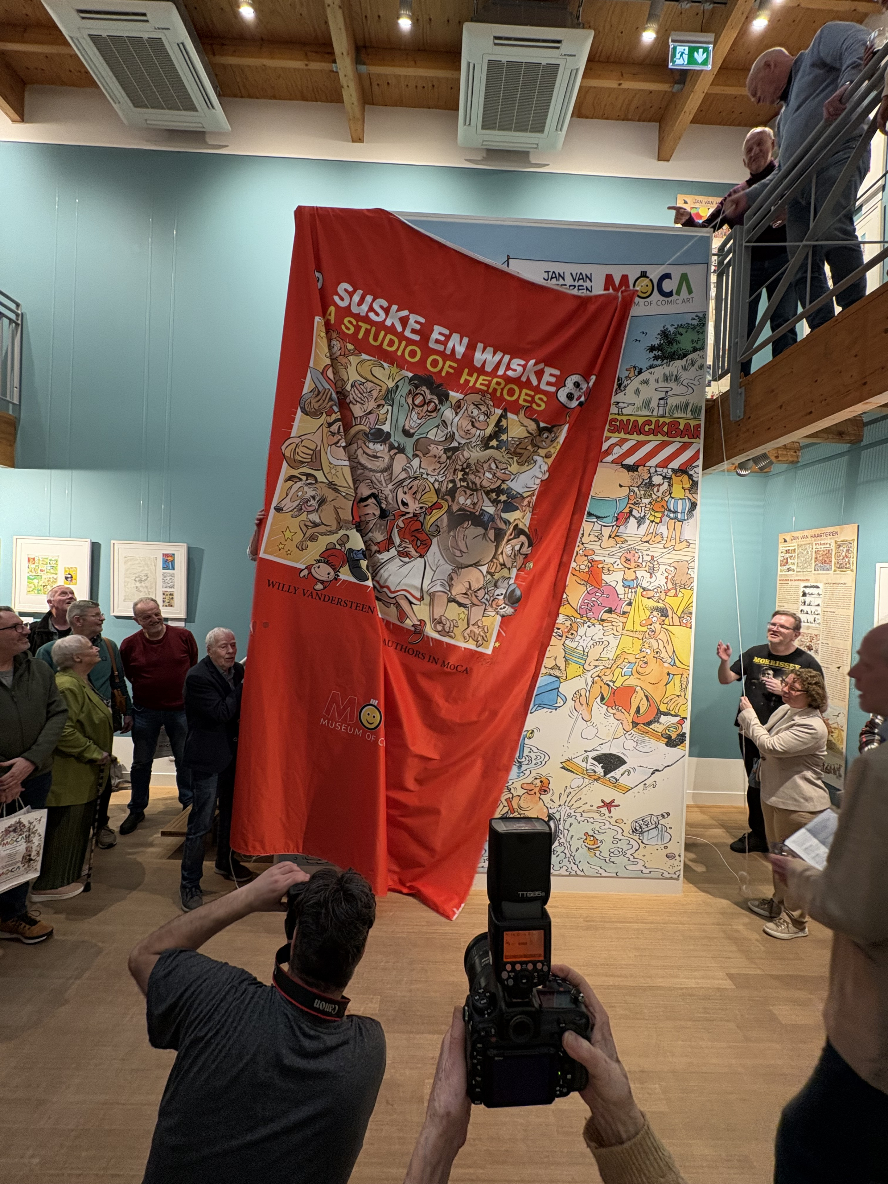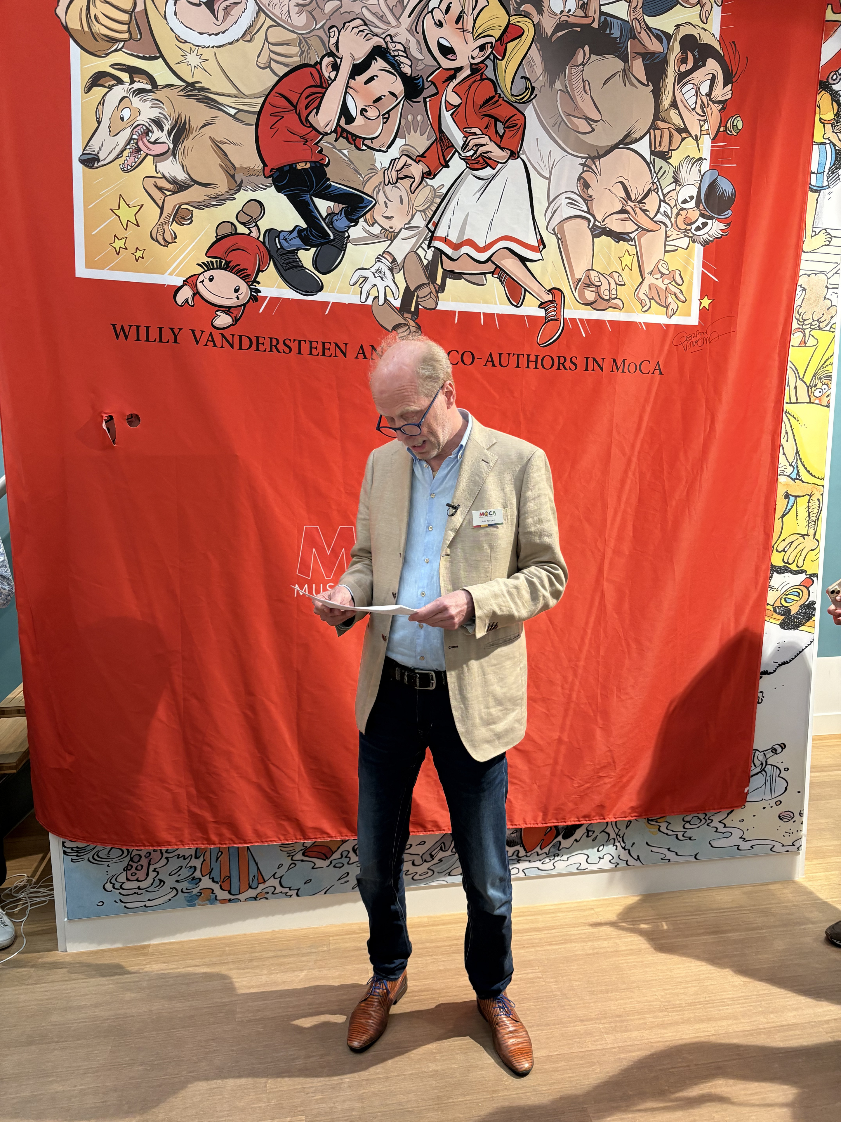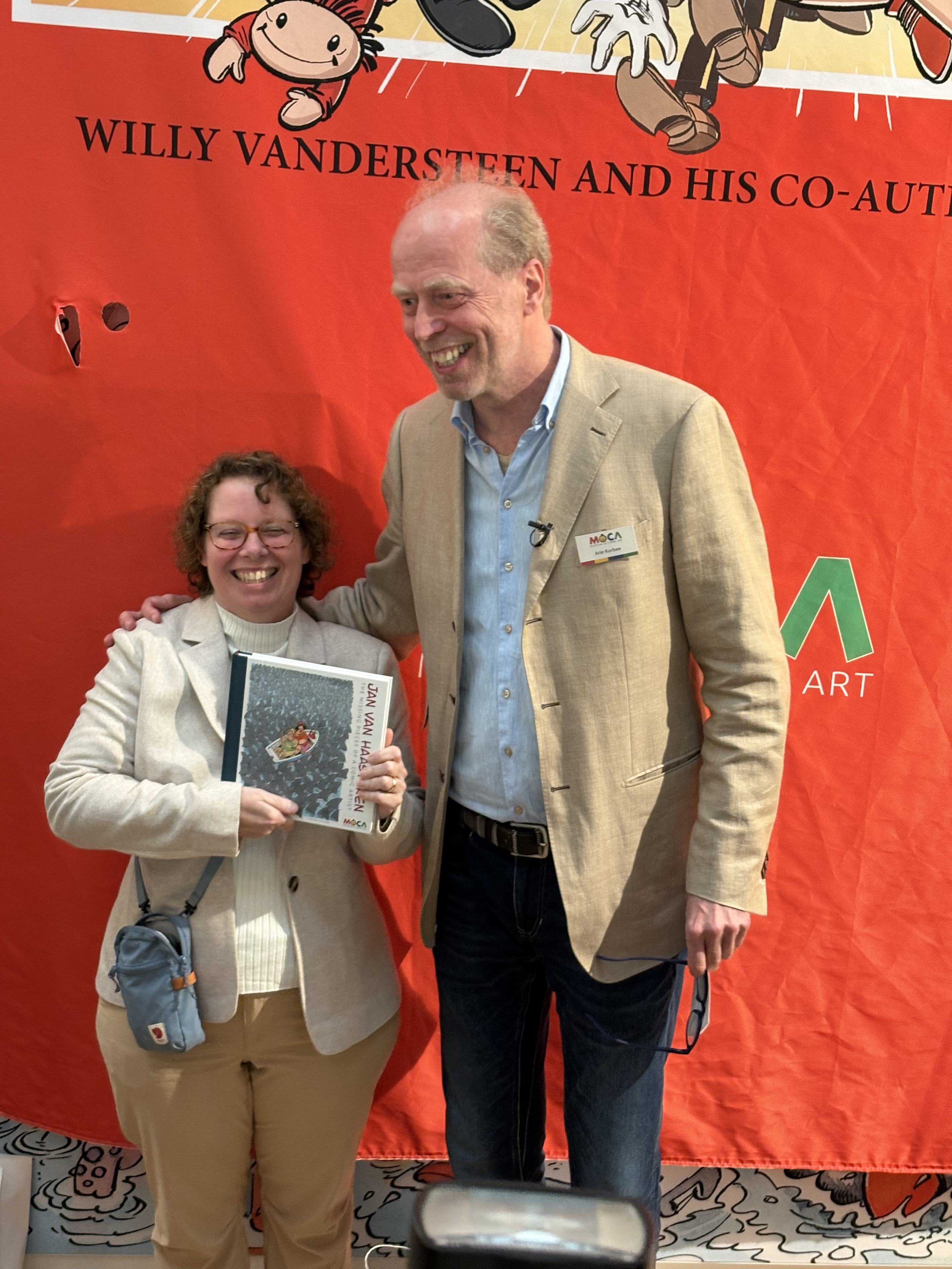 Zowel Jan van Haasteren, zijn dochter Saskia en curator van deze tentoonstelling, Ger Apeldoorn, ontvingen uit handen van MoCA voorzitter, Arie Korbee, het eerste exemplaar van de Limited Edition catalogus.