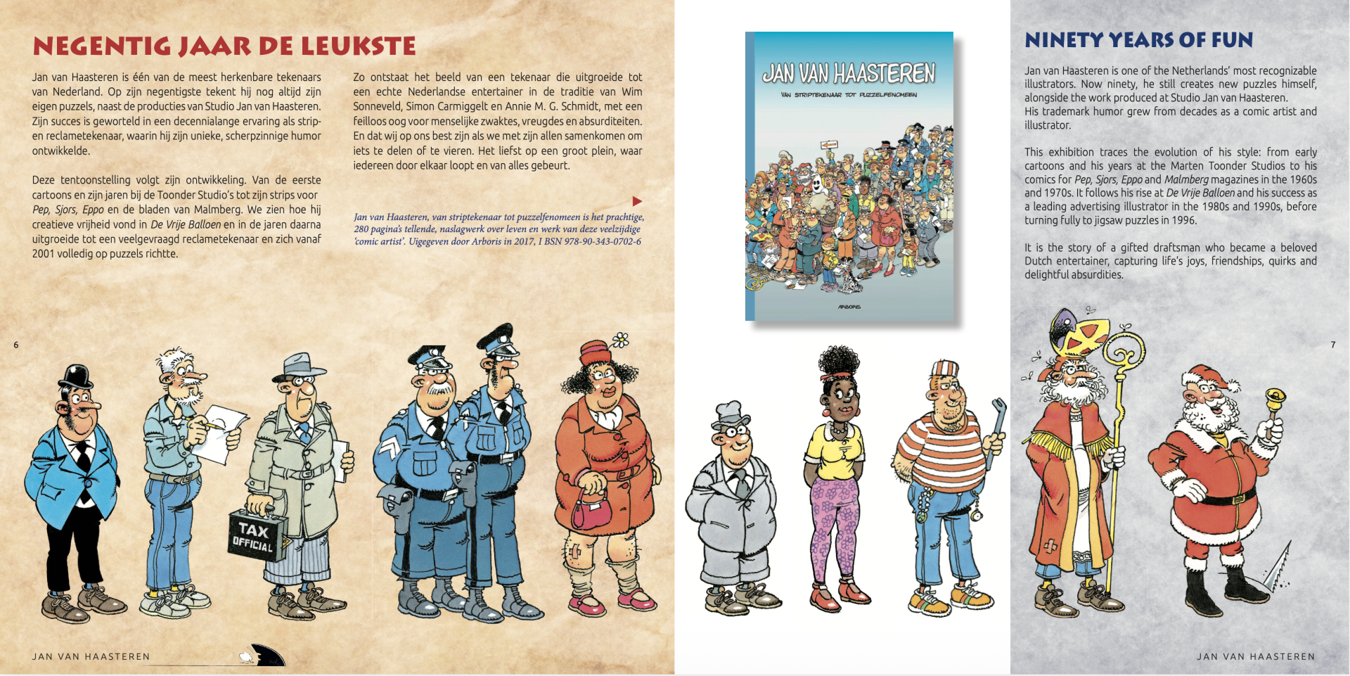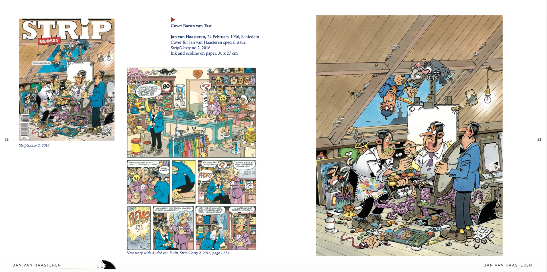 De luxe hardcover uitgave, genaaid gebonden – formaat 210 x 210 mm, bevat 168 pagina’s in kleur met veel beeldmateriaal van werken van de ontwikkeling van de veelzijdige striptekenaar Jan van Haasteren. De tentoonstelling